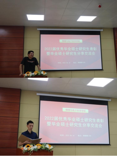 分享会伊始,辅导员乔玉配老师介绍了我院研究生就业与考博的相关情况。她指出,在学院领导和导师的共同努力下,2022届硕士研究生取得了较好的成绩。其中,首届物理一级学科硕士点毕业14人,发表SCI论文22篇,考取博士研究生8人,占比57%。同时,他还强调后疫情时代研究生就业形势依然严峻,希望2020级、2021级的各位同学与2019级优秀硕士毕业研究生代表积极交流,为今后就业早做准备,再创辉煌。