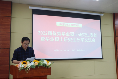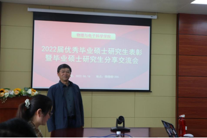 发言结束后,学院副院长董爱军副教授宣读2022届优秀毕业硕士研究生以及考取博士学生名单,教学质量检测与评估中心主任宋晓书教授、物理与电子科学学院党委书记陈世国教授对以上同学表示祝贺并进行表彰。