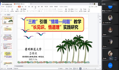 学术报告尾声,吕传汉教授与我院师生分享了“三教”引领“情境-问题”教学“长见识、悟道理”的优秀教学课例,并与同学们进行了线上互动交流,对学生提出的问题进行了耐心细致的回答,让在场师生深切感受到了吕老师渊博的学识、严谨的治学、独到的见解以及对教学工作的热爱,本次会议在对吕教授深深敬意中落下帷幕。