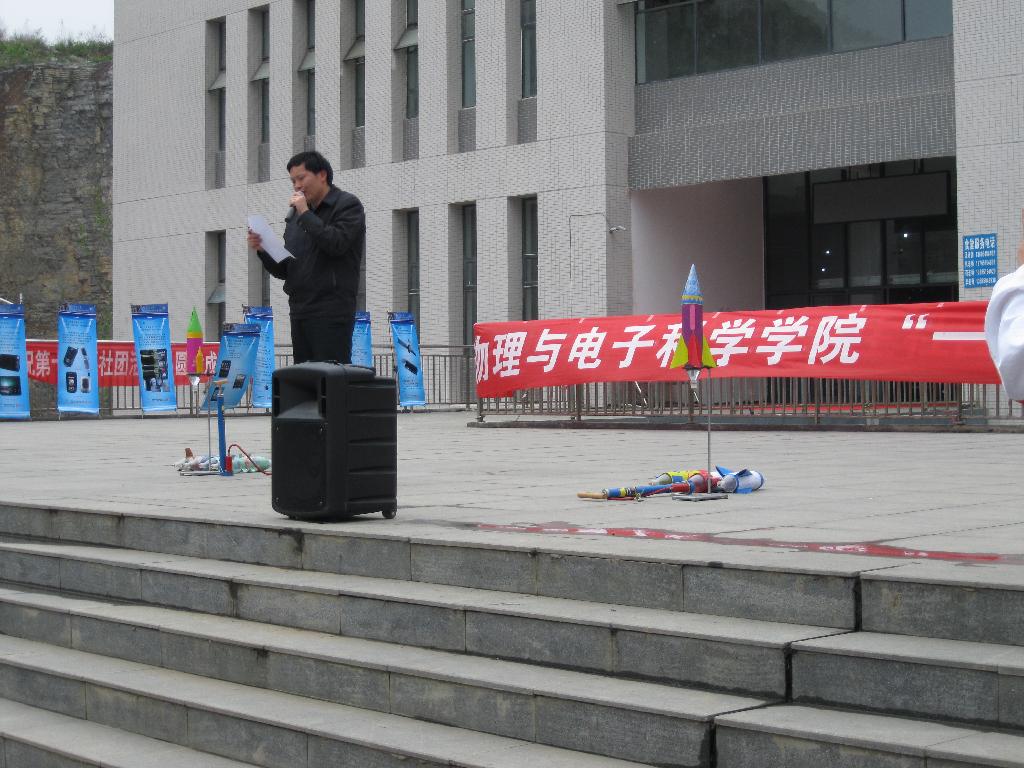 开幕式上,李应发老师首先致辞。总结了本次活动的情况,并对同学们提出了要求,他希望同学们充分利用好大学时光,学成而归。紧接着活动进入了“放飞水火箭”的环节,学生干部将水火箭放在铁架台上,并用汽枪给“火箭”输送“能量”,“火箭”霎那间就冲上了空中,震惊了现场的观众。接着秦老师还邀请了场边的同学亲参与了“水火箭”的发射过程,把现场的气氛推向了高潮。活动的最后一个是环节是观看物理知识展板,了解生活中的科技。