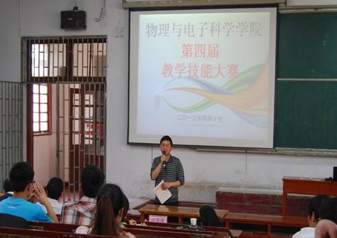 4月19日下午,物理与电子科学学院第四届学生教学技能大赛分别在物理楼731和733教室正式拉开帷幕。学院党委书记宇燕、院长陈世国、院党委副书记李应发、副院长宋晓书、物理学科主任沈光先、电信学科主任刘万松、各组指导教师、各年级辅导员以及广大学生出席本次大赛。