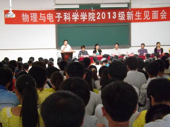 9月14日14:30,物理与电子科学学院在GJ6302教室隆重召开2013级新生见面会,出席会议的领导有:学院党委书记宇燕教授,院长陈世国教授,院党委副书记李应发副教授,副院长宋晓书教授、支启军教授,学院办公室主任李丽琴老师。2010级辅导员赵翠华老师、2012级辅导员魏佳妮老师、2013级辅导员张诚老师和杨柳老师以及2013级新生共540余人参加。会议由团委副书记、2012级辅导员吴培老师主持。
