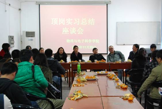 2013年11月26日,乐鱼体育在线平台(中国)官方网站,在物理实验楼三楼多媒体教室召开“顶岗实习总结座谈会”。出席会议的领导有物理与电子科学学院院长陈世国、副书记李应发、副院长宋晓书、支启军,物理系主任沈光先、大学物理教学部主任李琼敏,指导老师徐梅、周瑞雪,年级辅导员赵翠华以及顶岗实习的全体学生。会议由物理系主任沈光先主持。
