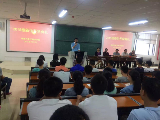 9月7日上午8:30,物理与电子科学学院2015级新生开学典礼在学院楼1522教室隆重召开。学院领导班子,教师代表、各年级辅导员与330名新生齐聚一堂。开学典礼由院团委书记秦欣老师主持。
