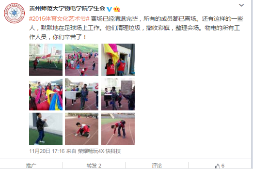 我院在花溪校区顺利闭幕的“贵州师范大学2015体育文化艺术节”中喜获佳绩。体育艺术节共历时三天,比赛分为多个项目,经过激烈角逐物电学院团体以荣获团体总分第二名,广播体操比赛获得三等奖,校园足球比赛荣获第五名。