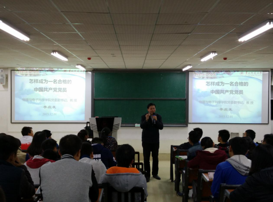 为贯彻落实学校实施的“启航计划”,不断夯实发展学生党员基础。12月01日,学院在花溪校区物电楼1522教室进行了《怎样成为一名合格的中国共产党党员》的专题党课,由学院党委副书记李应发教授主讲。2015级330名新生聆听了党课。