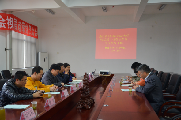 首先,陈世国书记代表学院对闽南师范大学物理与信息工程学院院长张跃聪一行的到来表示了热烈欢迎。随后,双方就各自学院的基本建设、师资力量、本科教学、学科建设、科研平台建设等情况进行了简要介绍。会上,宋晓书副院长就物理学通用技术方向专业的背景、师资力量等总体情况进行了介绍;物理系副主任吕兵老师就本专业的培养目标和对象、课程设置、人才培养等方面进行了详细的介绍。双方与会人员踊跃发言,就各自在学科建设、课程建设、团队建设、人才培养等的工作进行了广泛交流,共享经验做法,并就共同关心的一些问题达成了共识。