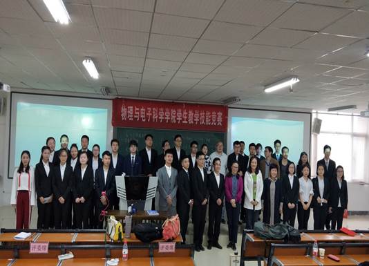 2018年4月27日下午13:00,由物理与电子科学学院开展的学生教学技能竞赛在物电学院1106、1521、1522三间教室同时进行。担任此次竞赛的评委有物理与电子科学学院党委书记陈世国,院长支启军,副院长肖文君,罗琴老师和庞礼军老师等。此次竞赛由田祎铃等参与主持,全院部分大三学生参加此次竞赛。
