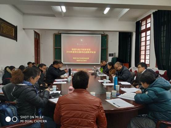 12月29日,物理与电子科学学院在学院楼会议室开展了2018年度教职工生党支部书记抓党建述职评议会。学院党委委员、各党支部委员和师生代表参加,党委副书记苏醒主持。