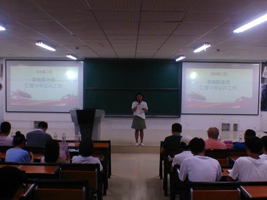 肖文君向大会宣读2020年物理与电子科学学院新兵入伍名单,会场PPT一一展示了光荣入伍同学的照片和名字,肖文君宣读完毕,再次向同学们光荣入伍表示祝贺。