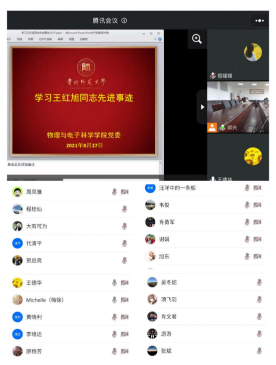 8月27日,物理与电子科学学院通过线上腾讯会议和线下结合召开会议,专题学习王红旭老师先进事迹,全体教职工参加会议,会议由学院党委书记陈世国主持。