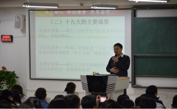 会上,周成海老师宣讲中指出重点把握党的十九大的鲜明主题、主要成果、重要启示,深刻领会新成就、新时代、新思想、新战略、新部署、新要求;并对我国社会主要矛盾的变化、统筹推进“五位一体”总布局,协调推进“四个全面”战略布局,新思想的科学内涵等方面的内容进行全面系统的解读。